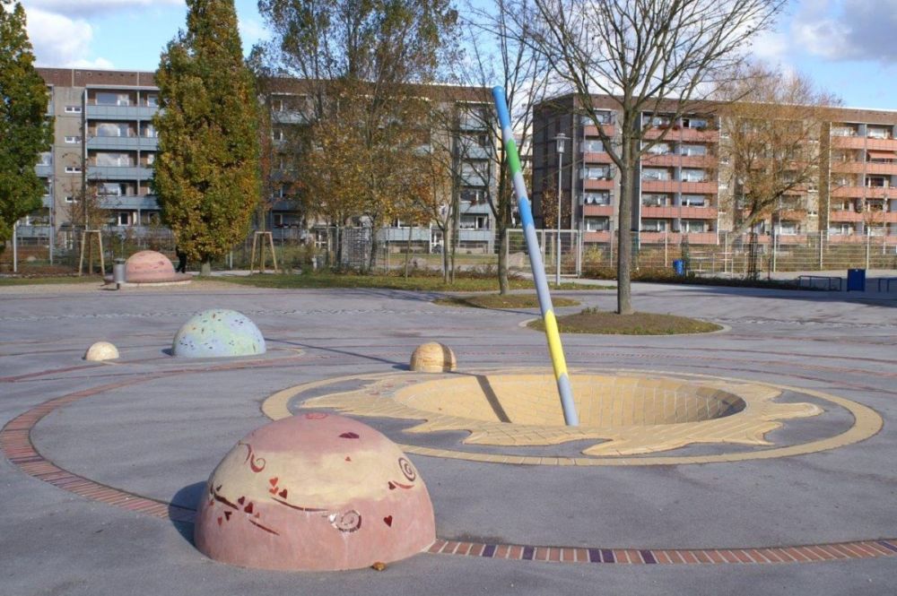 Hier finden Sie Plastermosaike aus Klinkern, oder auch Fliesen, sowie weich, dahin fließende Kantsteine. Die Arbeit "Schulhof als Universum" (gemeinsam mit Anke Meixner) vereinigt sowohl Pflastermosaike im Asphalt, Himmelskörper aus Beton mit Keramikeinlagen, als auch eine "Sonne" in Form einer großen Schale mit Sonnenuhr, einen "Saturn" mit Ringen zum "Verstecken" und ein "Schwarzes Loch".