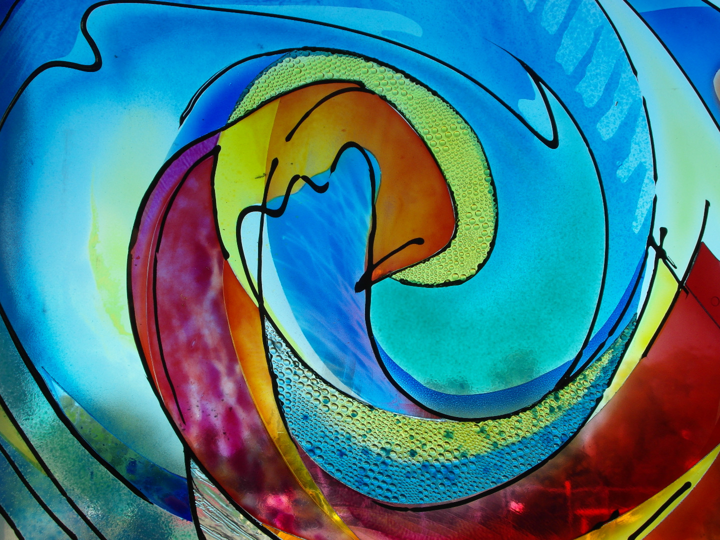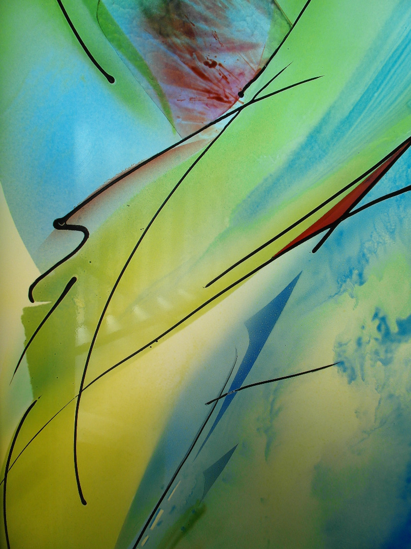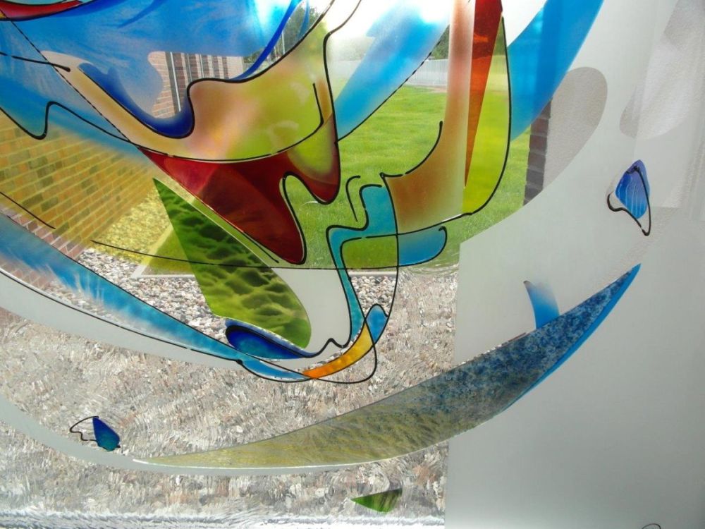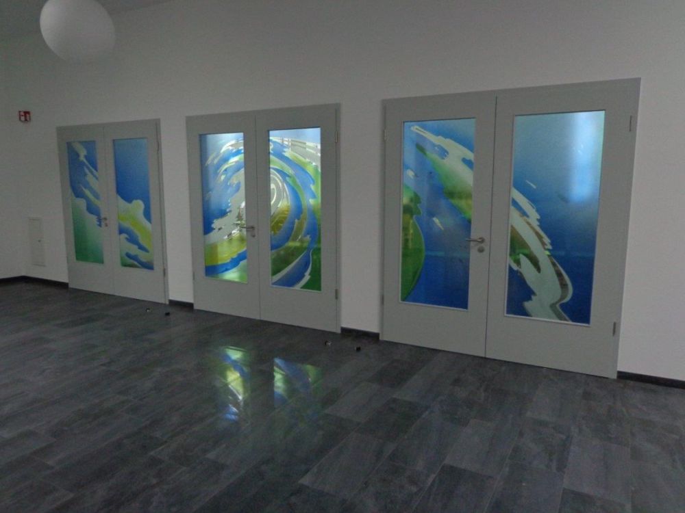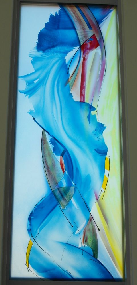 Für das große Fenster im Eingangsbereich habe ich den Arbeitstitel "Freude Pur" gewählt. Es ist ein vierteiliges 10 m hohes Fenster, gegliedert durch blickdichte sandgestrahlte Flächen und solche die transparent den Außenraum mit einbeziehen. Die eigentliche Malerei ist akzentuiert durch schwarze Konturen und durch aufgeklebte Antik- und Strukturgläser, die ihrerseits teilweise geätzt und bemalt sind.