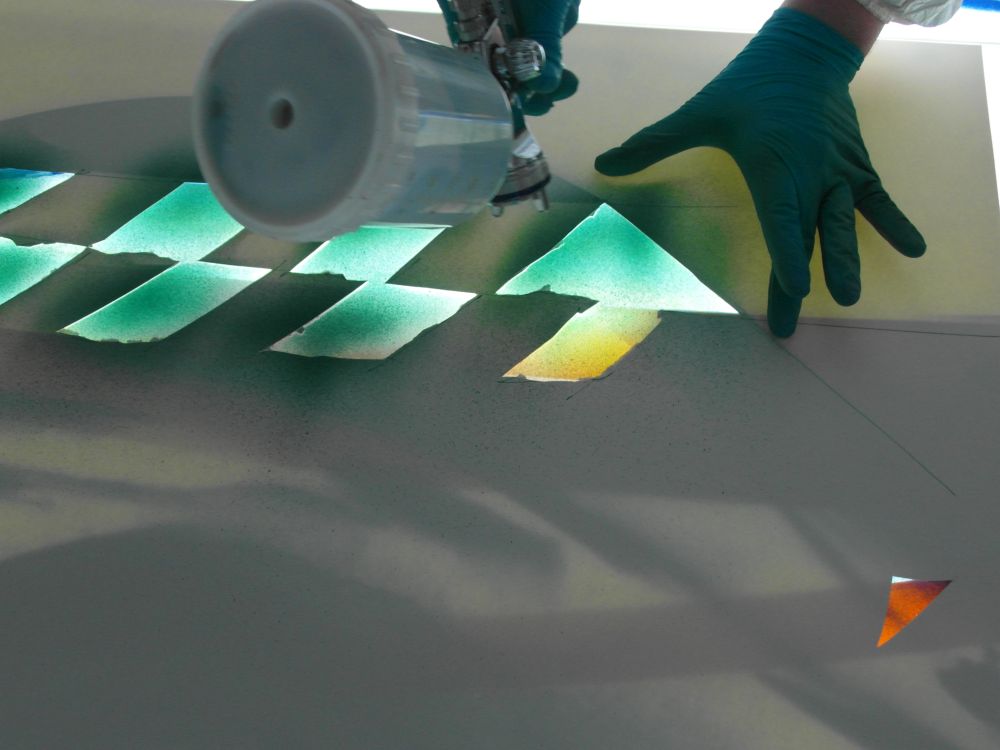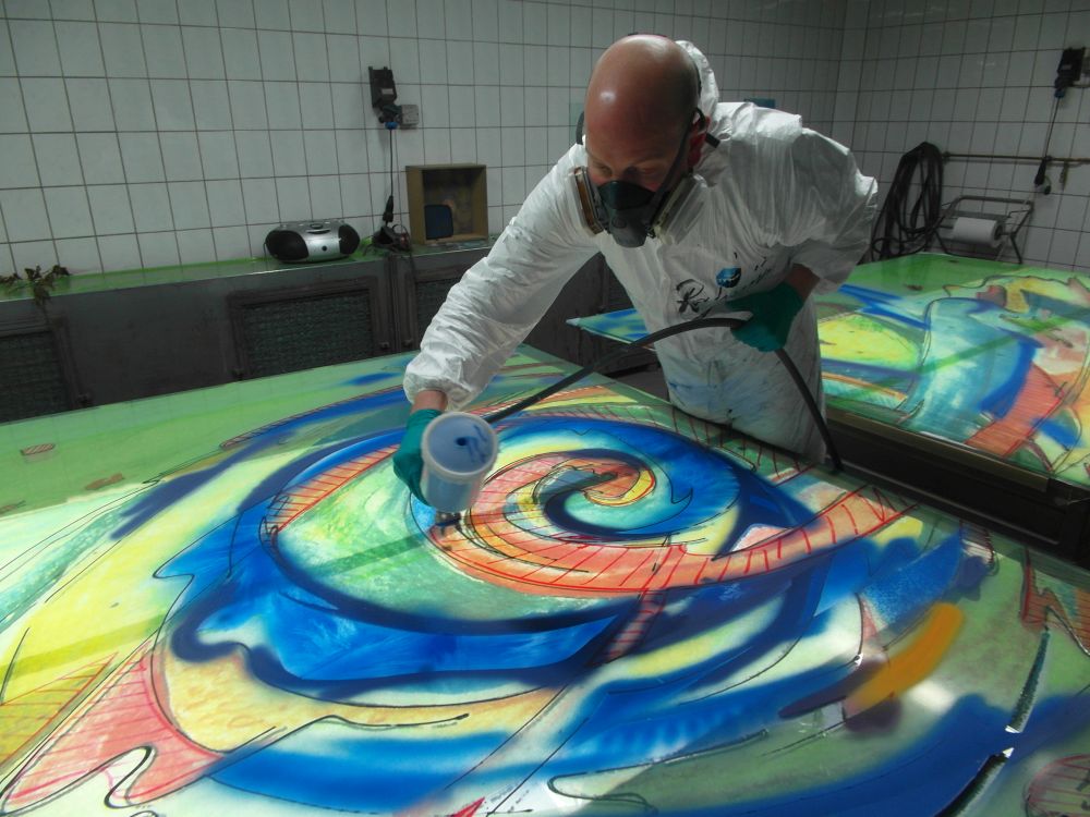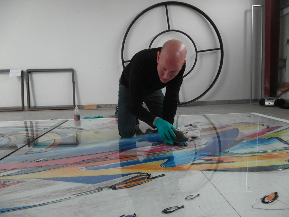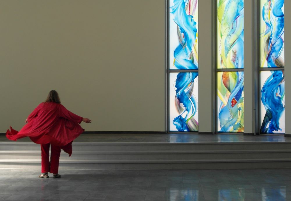 Für das große Fenster im Eingangsbereich habe ich den Arbeitstitel "Freude Pur" gewählt. Es ist ein vierteiliges 10 m hohes Fenster, gegliedert durch blickdichte sandgestrahlte Flächen und solche die transparent den Außenraum mit einbeziehen. Die eigentliche Malerei ist akzentuiert durch schwarze Konturen und durch aufgeklebte Antik- und Strukturgläser, die ihrerseits teilweise geätzt und bemalt sind.