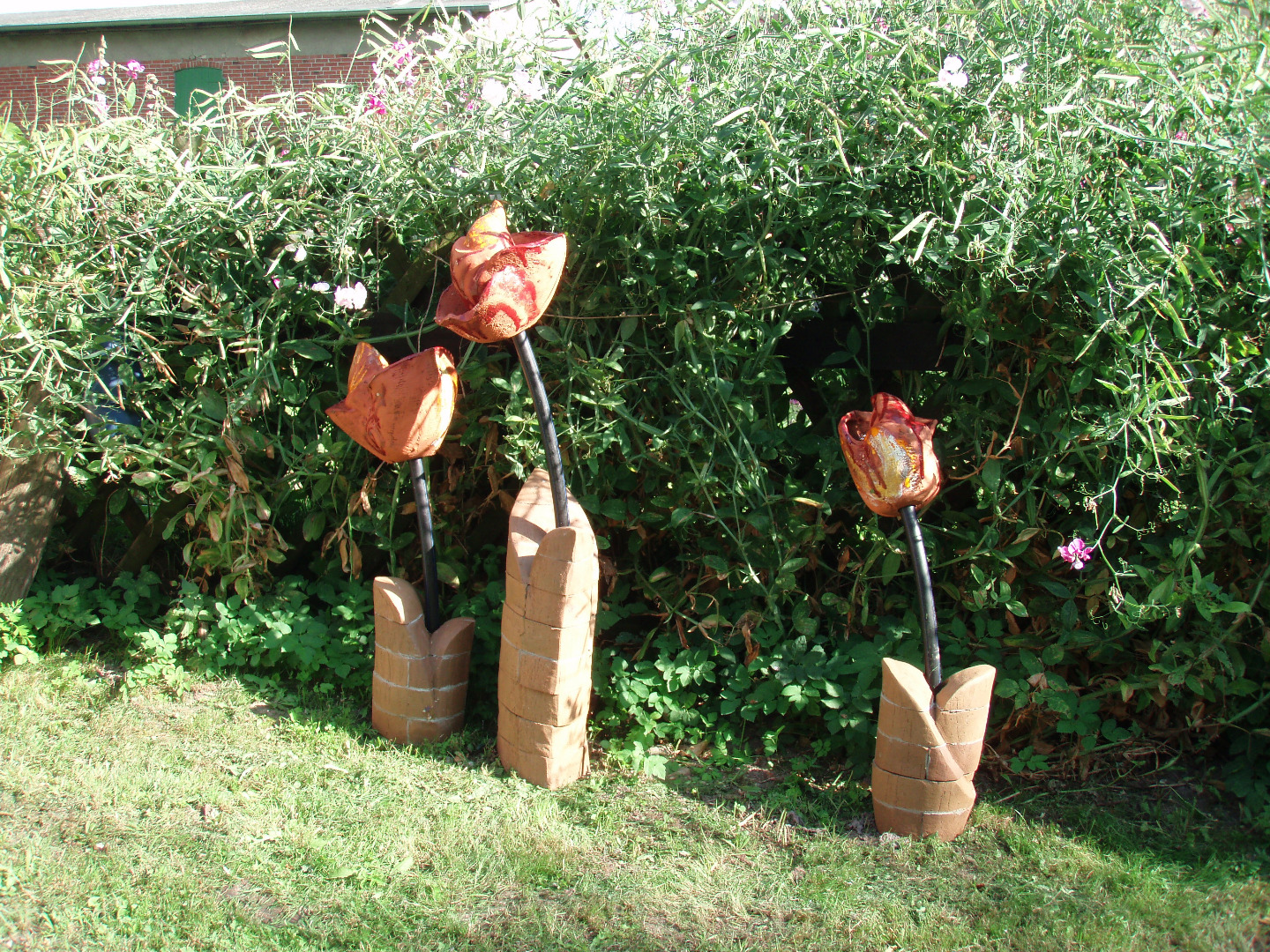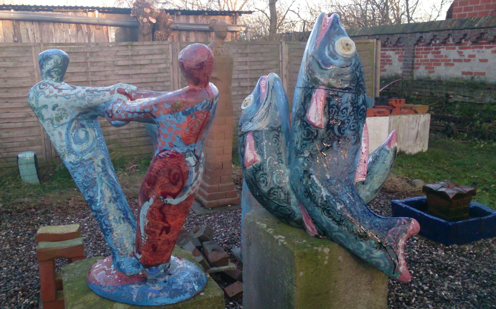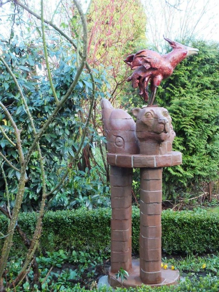 In meinen plastischen Arbeiten beschäftige ich mich mit Porträts, kleinen aber auch lebensgroßen Figuren, fantasievollen Pflanzen- und Tierplastiken. Es entstehen Objekte, die streng gebaut sind oder verspielt dekorativ, wie „ Zauberblumen“, Schachspiele, Schmuck, Handschmeichler, Nippes und Gartenplastik usw. ... Dabei gehe ich, was die Größe meines Elektroöfen betrifft, der immerhin 1 m hoch ist, bis an die Grenze der Machbakeit. Oder ich arbeite gleich im Werk mit Klinkern, wo ich mit dem Prinzip einzelner Bausteine fast keine Einschränkungen habe, auch nicht in der Farbigkeit.