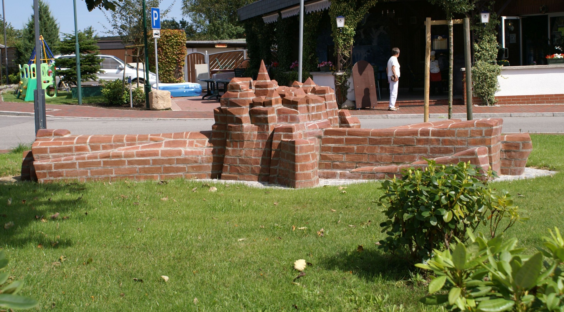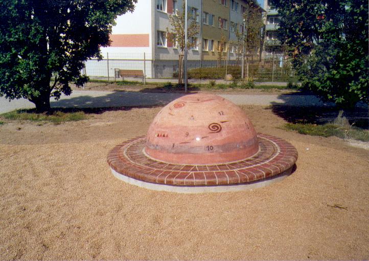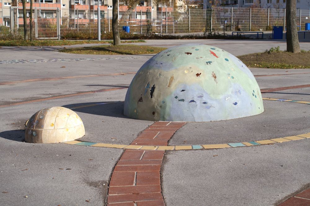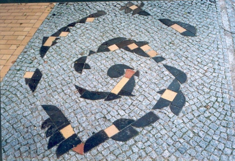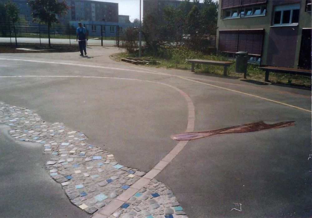 Hier finden Sie Plastermosaike aus Klinkern, oder auch Fliesen, sowie weich, dahin fließende Kantsteine. Die Arbeit "Schulhof als Universum" (gemeinsam mit Anke Meixner) vereinigt sowohl Pflastermosaike im Asphalt, Himmelskörper aus Beton mit Keramikeinlagen, als auch eine "Sonne" in Form einer großen Schale mit Sonnenuhr, einen "Saturn" mit Ringen zum "Verstecken" und ein "Schwarzes Loch".