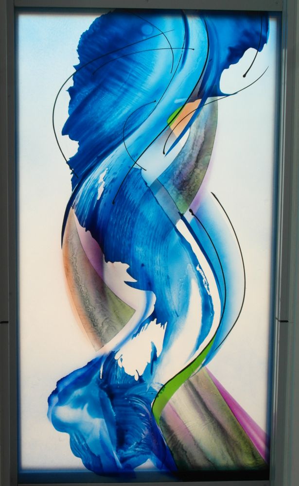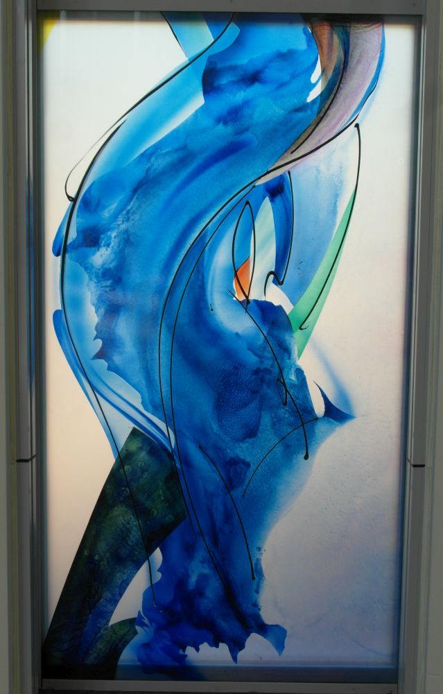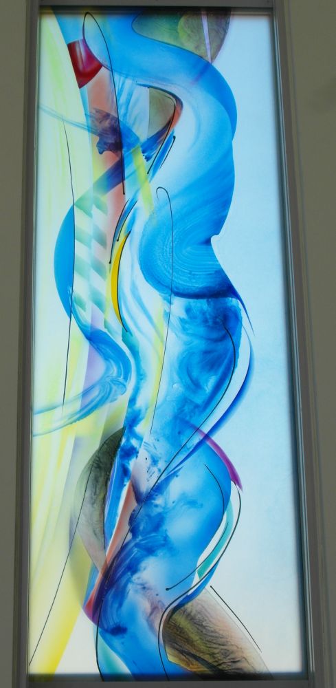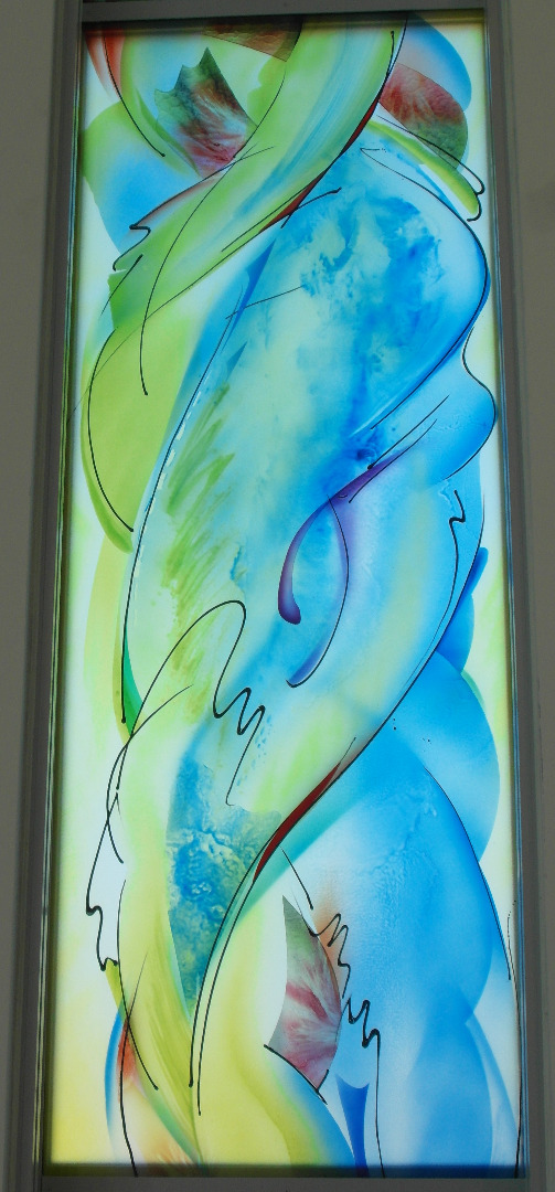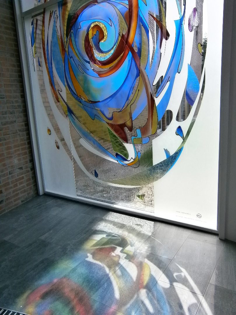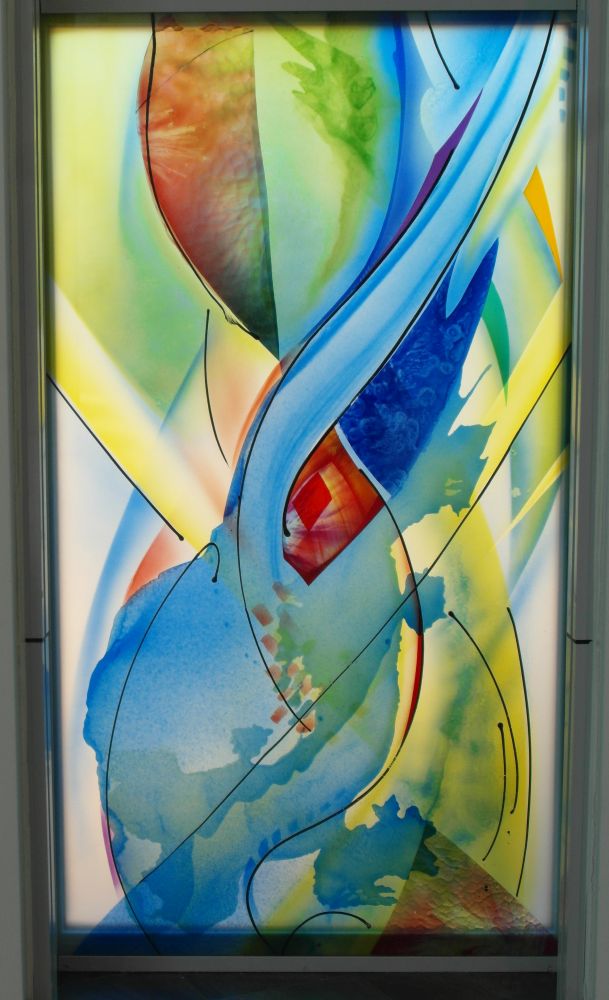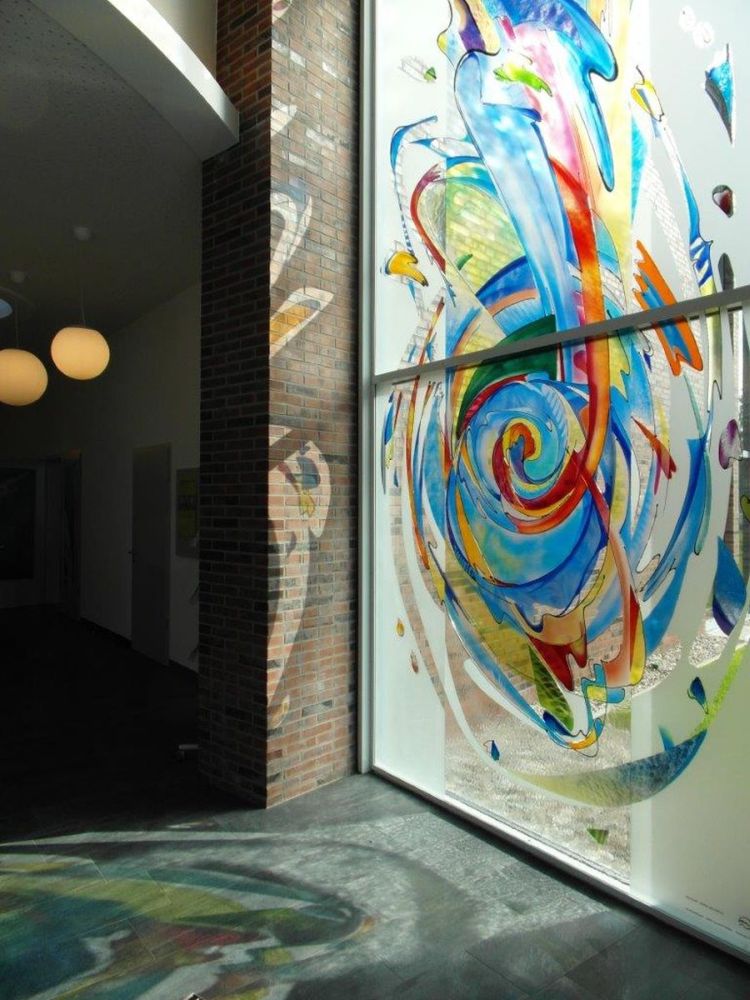 Für das große Fenster im Eingangsbereich habe ich den Arbeitstitel "Freude Pur" gewählt. Es ist ein vierteiliges 10 m hohes Fenster, gegliedert durch blickdichte sandgestrahlte Flächen und solche die transparent den Außenraum mit einbeziehen. Die eigentliche Malerei ist akzentuiert durch schwarze Konturen und durch aufgeklebte Antik- und Strukturgläser, die ihrerseits teilweise geätzt und bemalt sind.