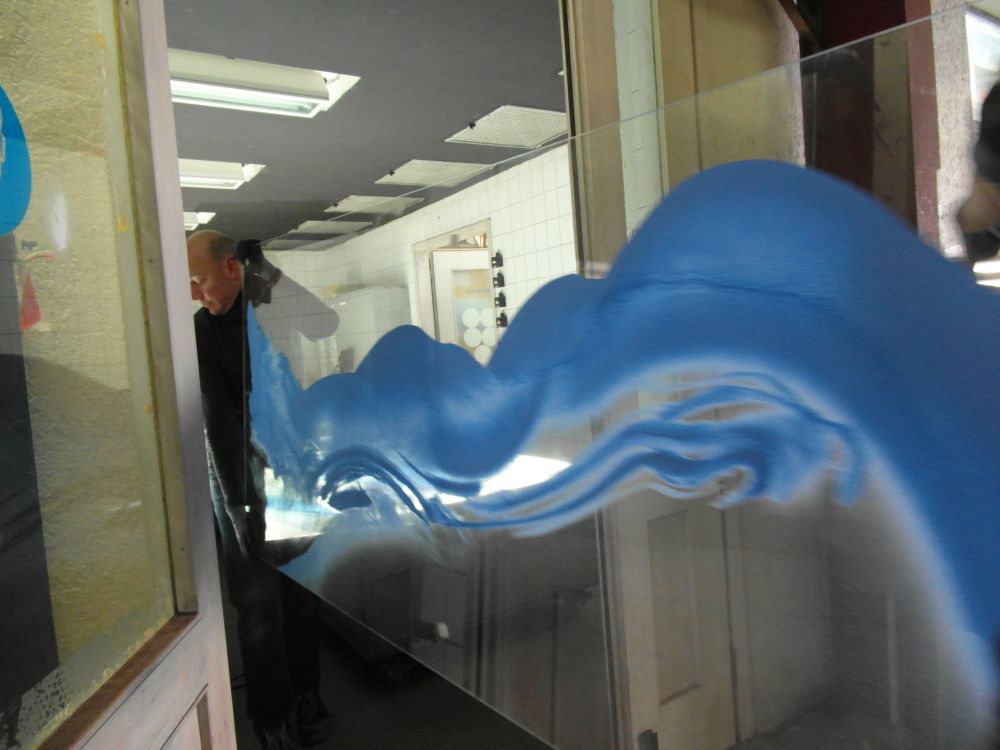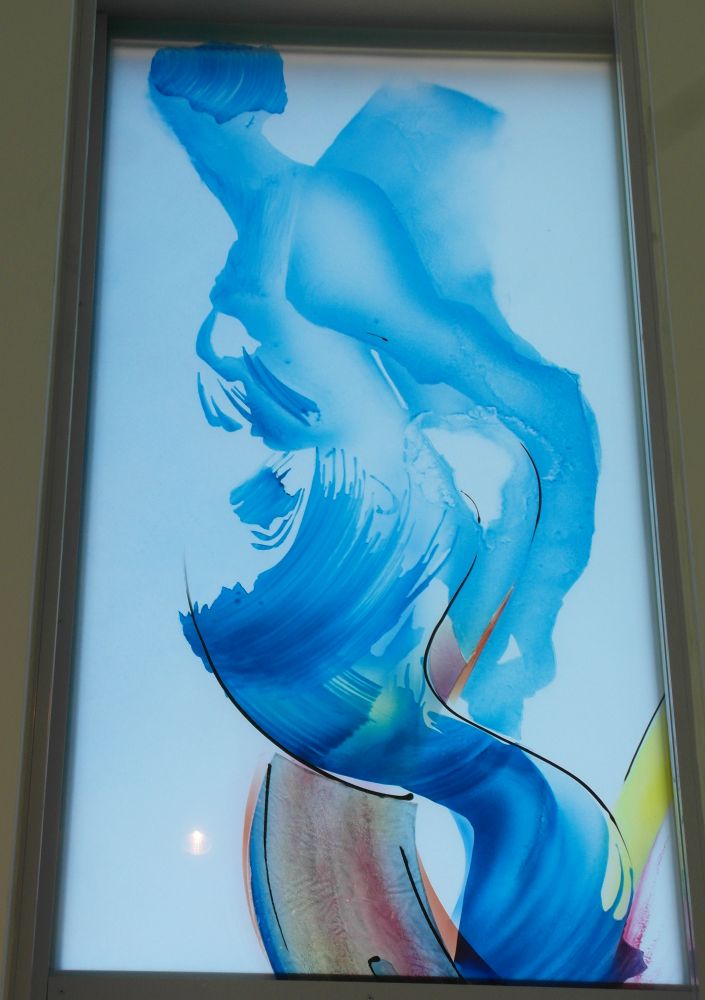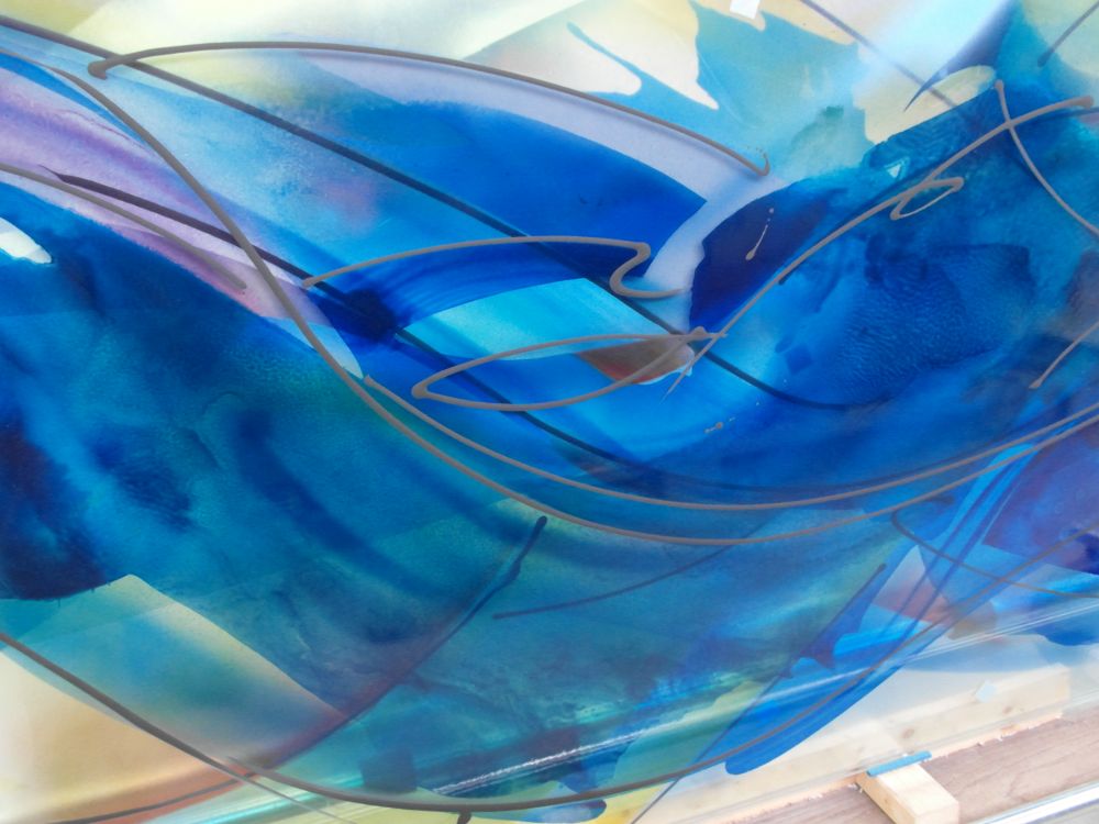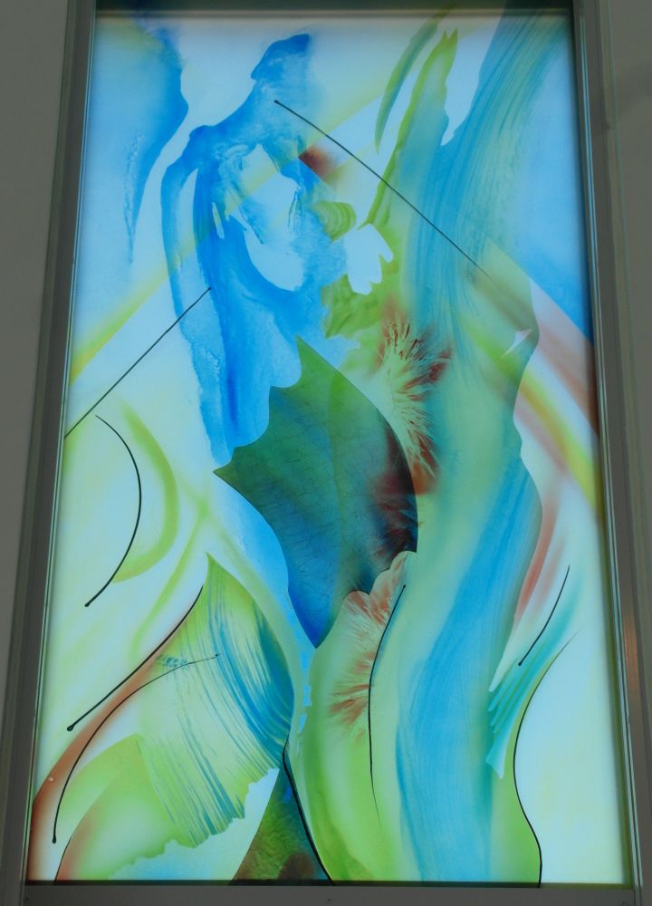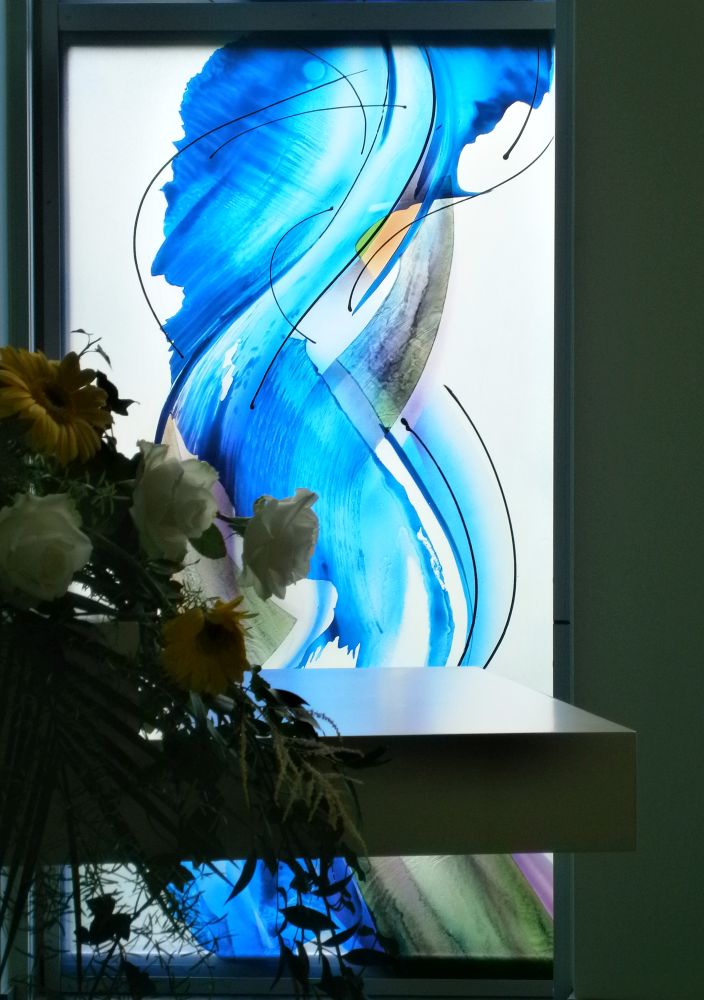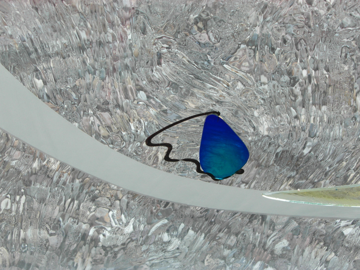 Für das große Fenster im Eingangsbereich habe ich den Arbeitstitel "Freude Pur" gewählt. Es ist ein vierteiliges 10 m hohes Fenster, gegliedert durch blickdichte sandgestrahlte Flächen und solche die transparent den Außenraum mit einbeziehen. Die eigentliche Malerei ist akzentuiert durch schwarze Konturen und durch aufgeklebte Antik- und Strukturgläser, die ihrerseits teilweise geätzt und bemalt sind.