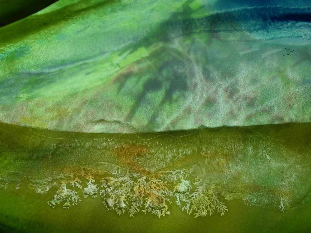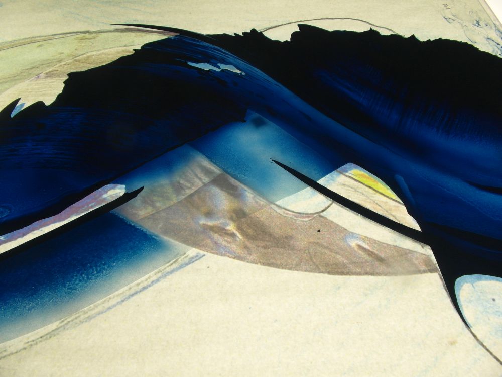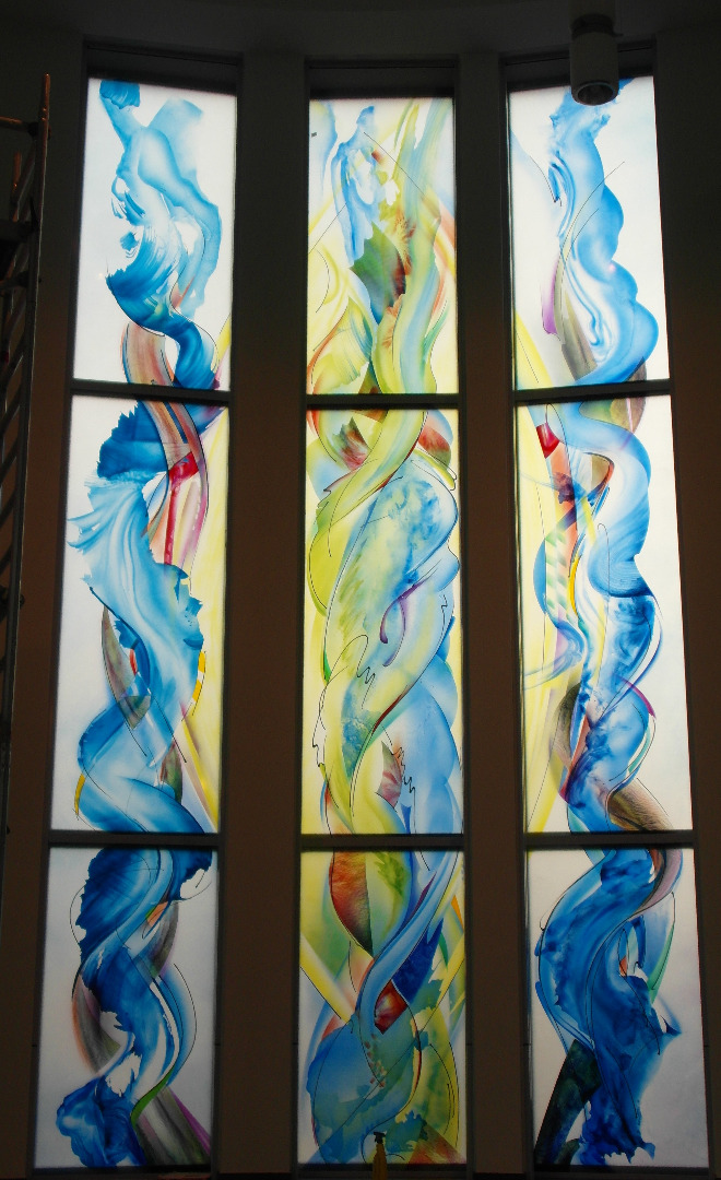 Für die drei Altarfenster ( jeweils ca. 7 m hoch) wählte ich den Arbeitstitel "Wege zum Licht". Auch hier handelt es sich um Glasmalerei mit Applikationen in Echtantikglas, die nach meinen Entwürfen und mit meiner Beteiligung von der Firma Derix exzellent ausgeführt wurden.