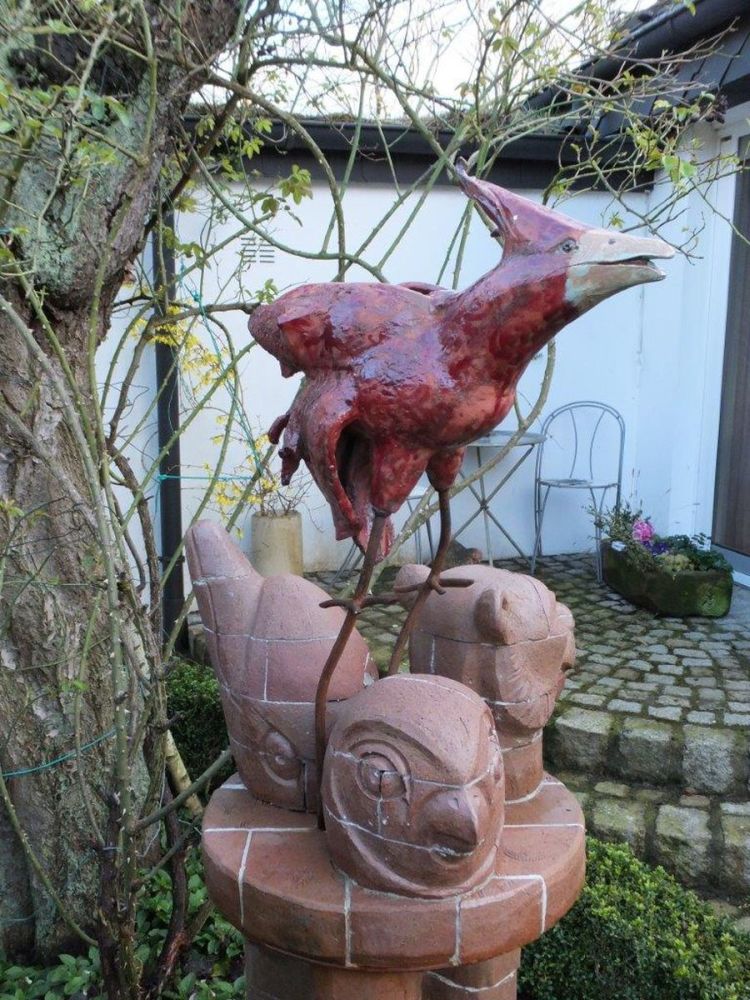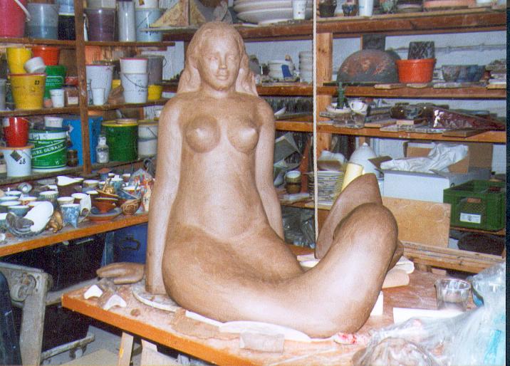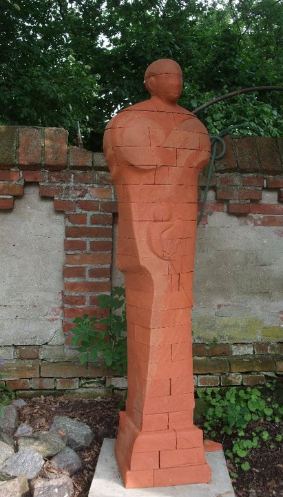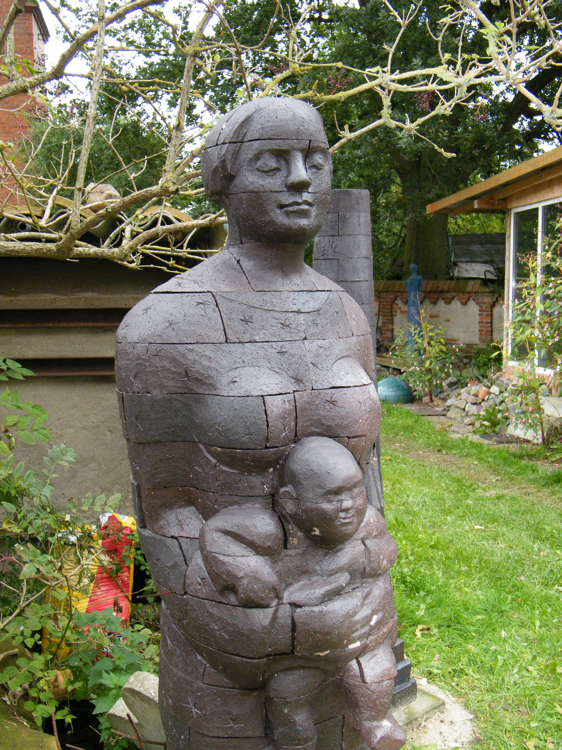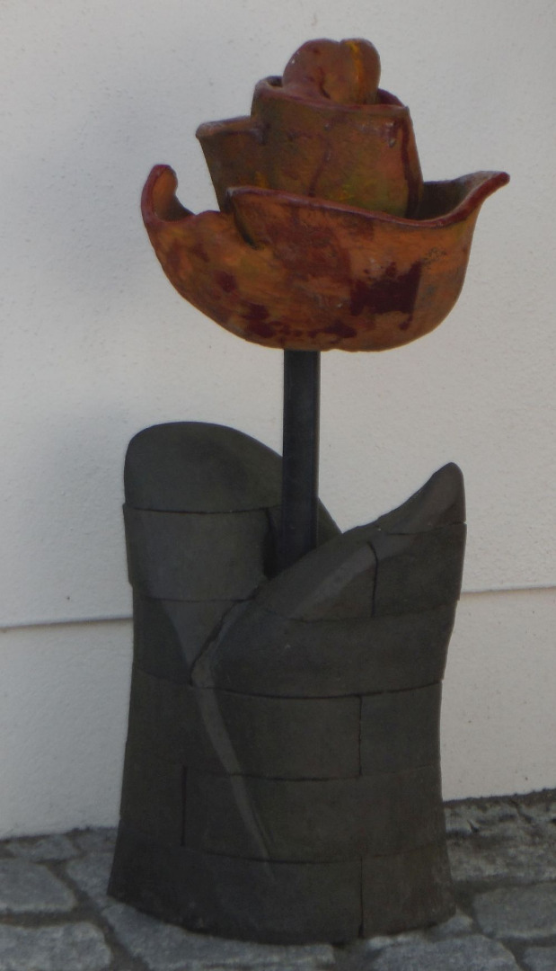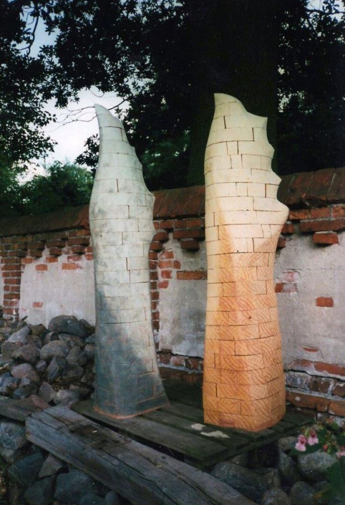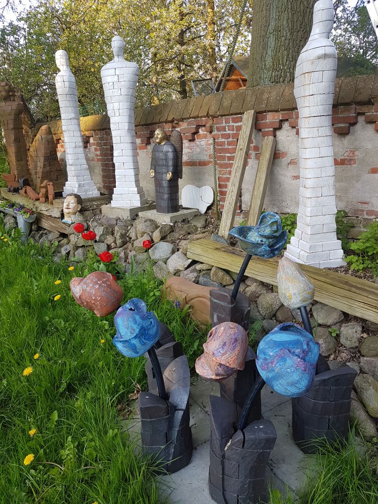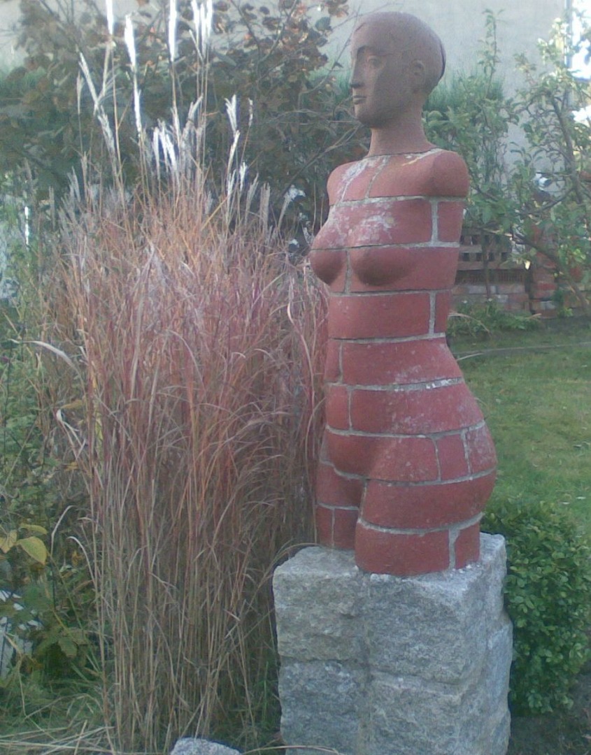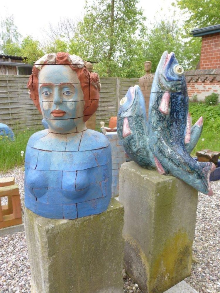 In meinen plastischen Arbeiten beschäftige ich mich mit Porträts, kleinen aber auch lebensgroßen Figuren, fantasievollen Pflanzen- und Tierplastiken. Es entstehen Objekte, die streng gebaut sind oder verspielt dekorativ, wie „ Zauberblumen“, Schachspiele, Schmuck, Handschmeichler, Nippes und Gartenplastik usw. ... Dabei gehe ich, was die Größe meines Elektroöfen betrifft, der immerhin 1 m hoch ist, bis an die Grenze der Machbakeit. Oder ich arbeite gleich im Werk mit Klinkern, wo ich mit dem Prinzip einzelner Bausteine fast keine Einschränkungen habe, auch nicht in der Farbigkeit.